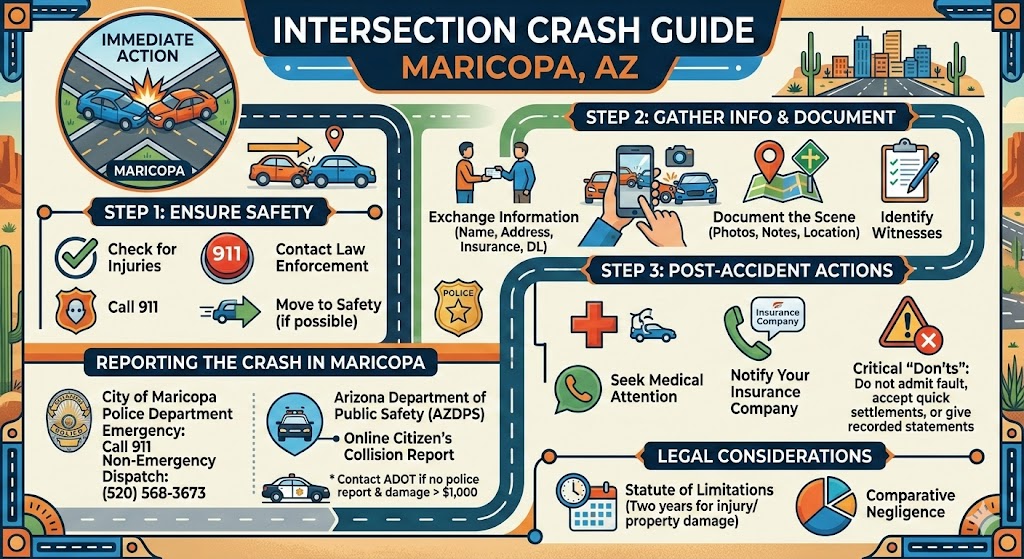 Get clear answers about intersection accident claims in Maricopa, Arizona — including common causes, dangerous crossroads like SR 347 and Honeycutt Road, your legal rights, and what to do after a crash.